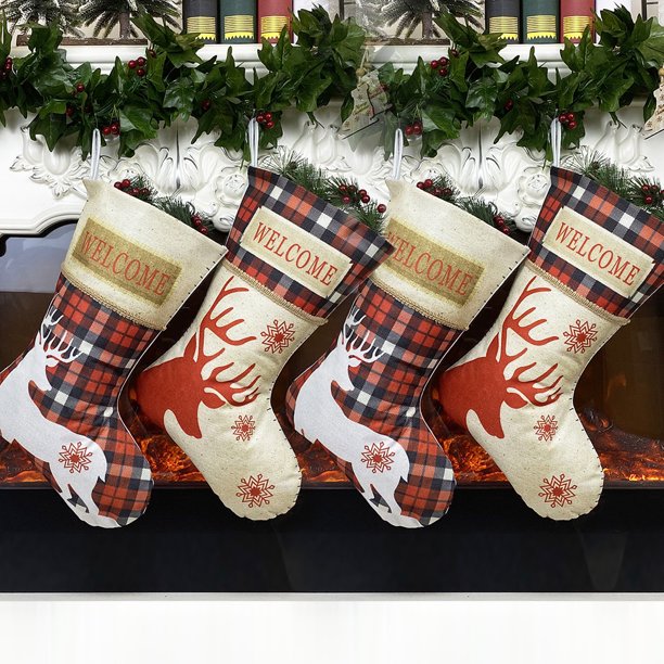 3For Christmas decoration it should be in a Christmas atmosphere and put it on the Christmas. FREE Shipping on orders over 25 shipped by Amazon. Christmas Stockings Set of 4 18 Large Xmas Stockings Burlap Plaid Style with Snowflake Santa Snowman Reindeer and Plush Faux Fur Cuff Family Hanging Socks for Xmas Gift Holiday Season Party Decor.